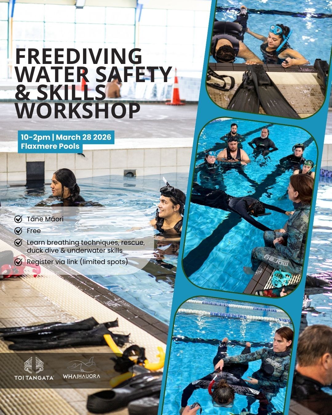 Delivered in a controlled pool environment, this workshop focuses on foundational skills that support safer freediving, snorkelling, and kai-gathering practices. Participants will learn: