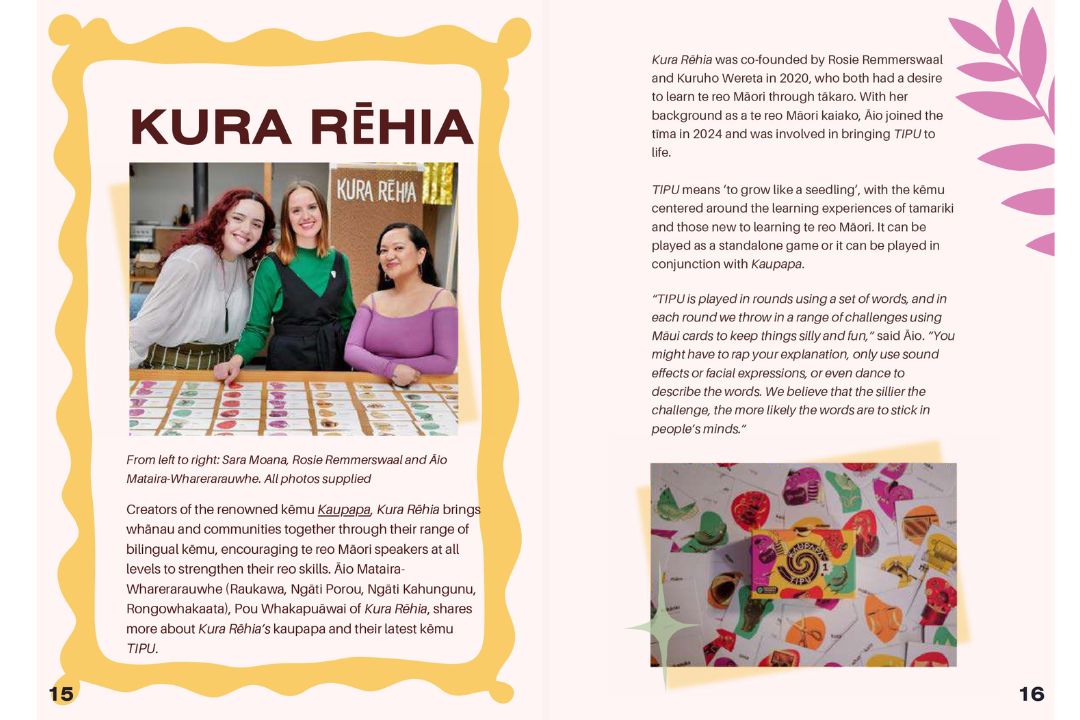 Designed as a digital zine, Cameron’s project sets out to platform diverse Māori voices and perspectives showcasing that Tākaro lives in dance, hākinakina, kura taiao, pūrākau, maramataka rhythms, and everyday community practice. Rather than defining Tākaro, Cameron allows people to define it for themselves.